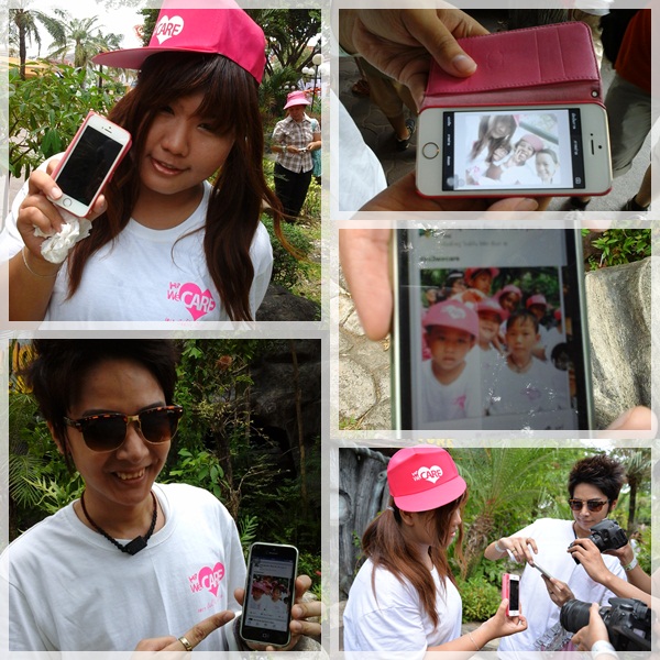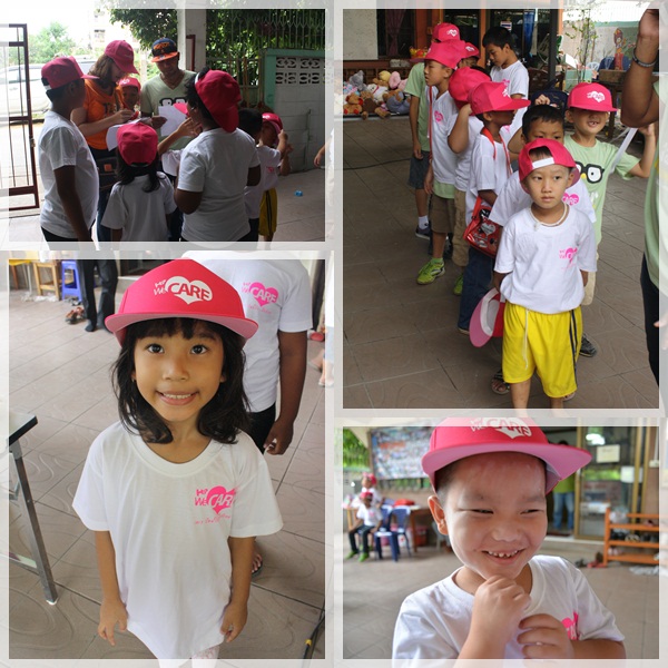 พี่สาว We Care แจกเสื้อให้น้องๆ ก่อนเดินไปทางสวนสยาม