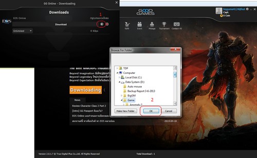 7. กดปุ่มเริ่มทำการ Download ที่กรอบสีแดงหมายเลข 1 และ เลือก Directory ปลายทางที่จะเก็บไฟล์และกด ok ในกรอบสีแดงหมายเลข 2