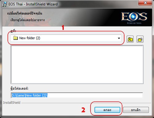 7. กำหนด Directory ปลายทางโดยเลือกจากในกรอบสีแดงหมายเลข 1 และกด ตกลง ที่กรอบสีแดงหมายเลข 2