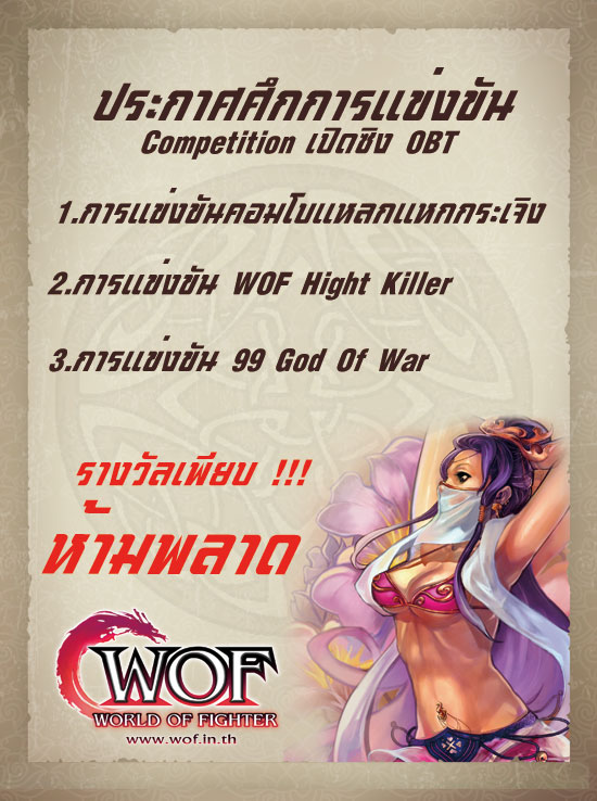 WOF เปิด Open Beta อย่างเป็นทางการแล้ว กับเกมส์แนวอาเขตที่มีรูปแบบเด่นเป็นเอกลักษณ์ไม่เหมือนเกมส์อื่น เป็นเกมส์ MMORPG แอ็คชั่นคอมโบเต็มรูปแบบ มันส์สะใจด้วยระบบ PK ที่จะทำให้คุณตื่นเต้น พร้อมผจญภัยพบแม่ทัพขุนพลแห่งสามก๊กที่คุณต้องรู้จักอย่างแน่นอน อาทิ ลิโป้, เล่าปี่, โจโฉ และจูล่ง ฯ ขอบอกว่าเกมนี้ต่อให้มีเลเวลเยอะ ก็ใช่ที่จะ PK ชนะเสมอไป เพราะเขาวัดฝีมือ PK กันที่ฝีมือล้วนๆ