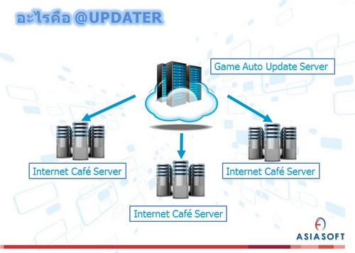 @Updater เป็นโปรแกรม Auto Game Update ที่ถูกพัฒนาขึ้นสำหรับธุรกิจร้านเกมโดยเฉพาะ ซึ่งจะช่วยลดภาระและค่าใช้จ่ายด้านการบริหารจัดการของร้านลดเวลาและขั้นตอน อันยุ่งยากในการติดตั้งเกมใหม่หรืออัพเดต patch ใหม่อยู่เป็นประจำ ด้วยความสามารถของ @Updater เกมและ patch ต่างๆ จะถูกติดตั้งแบบอัตโมัติ