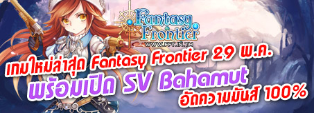 ในวันนี้ 29 พ.ค. 57 จะมีการเปิด SV ใหม่ Bahamut แห่งเกมส์ Fantasy Frontier ให้มันส์กัน 100% ทะยานสู่โลกกว้าง พร้อมร่ายมนต์อสูรคู่ใจ กับเกมสไตล์ MMORPG ผจญภัยโลกกว้าง ค้นคว้าหาเพื่อนใหม่ และเหล่ามนต์อสูรที่สามารถเลือกร่ายได้หลายสิบชนิด พร้อมเนื้อเรื่องสุดแฟนตาเซียที่น่าติดตามก่อนใครกับมหากาฬเกมส์ออนไลน์ของปี 2014 Fantasy Frontier