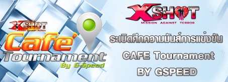 เพิ่งจบศึกใหญ่อย่าง XSHOT Road To China ไปหมาดๆ วันนี้ XSHOT ได้เปิดรับสมัครทีมเข้าร่วมการแข่งขันสุดมันส์อย่าง Café Tournament By Gspeed เพื่อชิงตัวแทนในแต่ละร้านไปแข่งกับร้านอื่นๆในละแวกนั้น เพื่อชิงความเป็นจ้าวแห่ง XSHOT ในโซนงามวงศ์วานและราชปรารภ ซึ่งจะเปิดรับสมัครในวันที่ 19 ก.ค. 57 และแข่งขันในวันเดียวกันเลย ซึ่งตัวแทนในแต่ละร้านจะถูกคัดเลือกเพียงแค่ 5 คนเท่านั้น และตัวแทน 5 คนนั้นต้องไปแข่งขันกับตัวแทนของร้านอื่นๆ เพื่อที่จะเป็นอันดับหนึ่งในรายการ Café Tournament By Gspeed