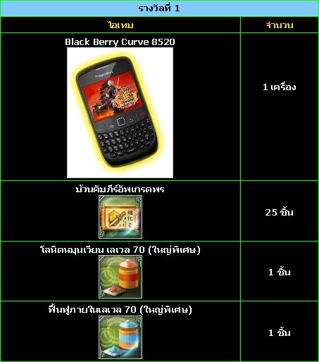 เพียงเพื่อนๆ ทำการเก็บเลเวลตัวละครภายใน ID เกมส์ Chinese Hero Online ให้ได้เกิน 60 ขึ้นไป ภายในวันที่ 14 มีนาคม 2554 เวลา 7.00 น. ก็ลุ้นรับรางวัลสุดแรง “Black Berry Curve 8520” พร้อมรางวัลอื่นๆ ไปใช้กันฟรีๆ