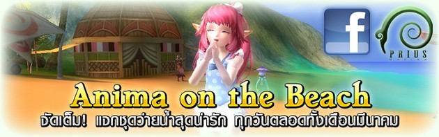 มากันอีกแล้วกับกิจกรรมใหม่ของเกมส์ Prius Online เอาใจสาวกภูติน้อย Anima กับกิจกรรม “Anima On the Beach” ง่ายๆเพียงแค่เพื่อนๆเปลี่ยนภาพ Facebook Profile ของเพื่อนๆเองเป็นภาพน้อง Anima ลั๊นลาในชุดว่ายน้ำลาย ซึ่งรูปดังกล่าวก็อยู่ข้างล่างนี้แล้วจากนั้นมารายงานตัวที่ Facebook.com/GSLive โดยต้องมากด Like ที่หัวข้อ Status “Anima On the Beach” แล้วโพส ชื่อตัวละคร พร้อม Server ที่ต้องการรับรางวัลไว้ด้วย