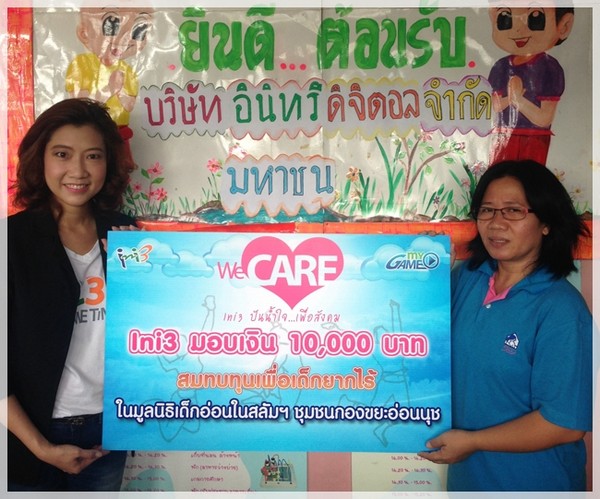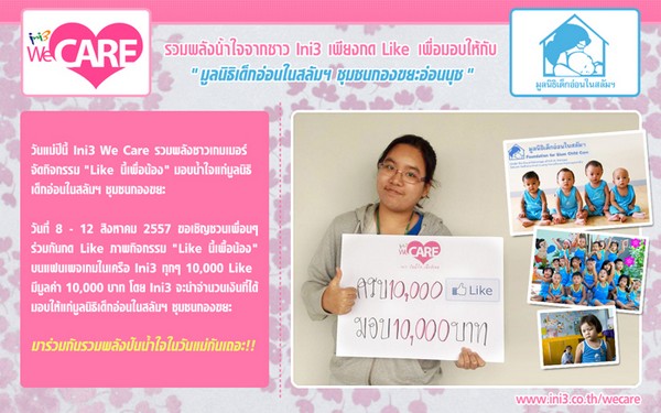 และครั้งนี้เป็นอีกครั้งที่ทำให้ทีมงาน และชาวเกมเมอร์ทุกคนได้อิ่มใจ เมื่อกิจกรรมดีๆ จาก Ini3 We Care อย่าง “Like นี้เพื่อน้อง” โดยเชิญชวนชาวเกมเมอร์ทุกท่านรวมพลังน้ำใจมอบ Like เพื่อสมทบทุนให้แก่น้องๆ มูลนิธิเด็กอ่อนในสลัมฯ “บ้านแห่งความหวัง ชุมชนกองขยะอ่อนนุช” ซึ่งจัดขึ้นในช่วงเทศกาลวันแม่ ระหว่างวันที่ 8 – 12 สิงหาคม 2557 ที่ผ่านมา