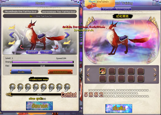 เมื่อวัตถุดิบพร้อมก็กดอัพเกรดสัตว์ขี่ได้เลย ทางขวาจะบอกถึงสัตว์ขี่ปัจจุบัน จากภาพกดพัฒนาจนได้ 5 ระดับแล้วสัตว์ขี่ก็จะเปลี่ยนจากสีน้ำตาลเป็นสีชมพูดสดใสน่ารักน่าขี่มากขึ้น แถมยังมีหางงอกออกมา 5 หางอีกด้วย ส่วนด้านซ้ายเป็นร่างที่พัฒนาถึงขึ้น 10 จะเห็นว่ามีสีม่วงสดใสพร้อมใส่ออพชั่นเรียบร้อยสวยเท่สะดุดตา แต่ต้องบอกก่อนเลยว่ากว่าจะได้ถึงขั้นนี้เล่นเอาเหนื่อยเลยล่ะครับ