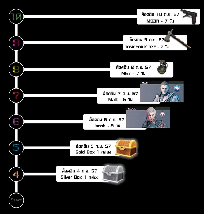 3. จากนั้นจะปรากฏรายชื่อไอเทมที่ผู้เล่นสามารถรับได้ แต่สามารถรับของรางวัลได้ตามวันที่กำหนดเท่านั้น ไม่สามารถรับย้อนหลังได้