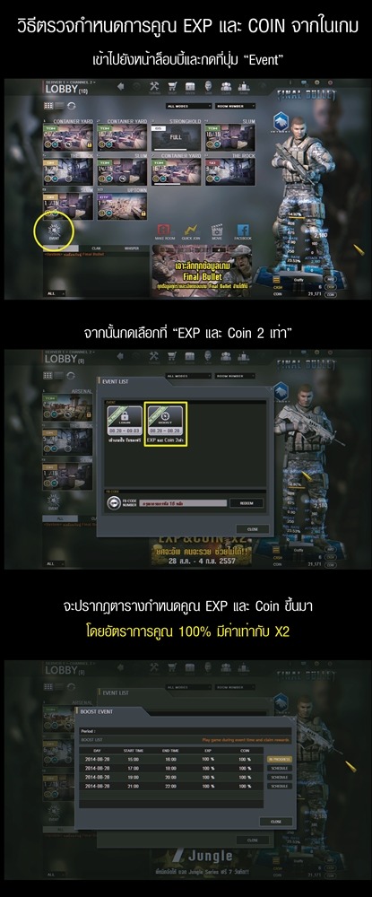 เอาใจผู้เล่นชาว Final Bullet ทุกท่าน ด้วยกิจกรรมคูณ คูณ แล้วก็คูณ ทั้งค่าประสบการณ์และ Coin ตลอดระยะเวลา 1 สัปดาห์ อยากอัพยศไวๆ อยากมีเงินใช้เยอะๆ ทำตัวให้ว่างแล้วเข้ามาเล่นเกม Final Bullet เลย