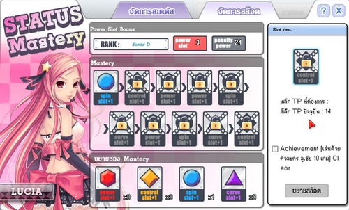 - สเตตัสสล๊อตแต่ละอันจะต้องอัพเป็นขั้นไปเรื่อยๆ ขั้นใดล๊อกอยู่ จะต้องเคลียเงื่อนไข Achievement เสียก่อนถึงจะทำการอัพได้ เช่น เล่นตัวละครฮานะ 50 รอบ / ยศมากกว่า JuniorE เป็นต้น