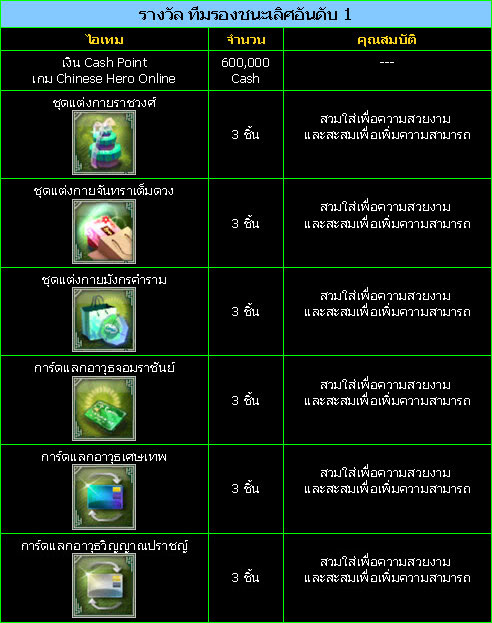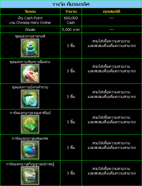 โดยทางทีมงาน Chinese Hero Online ขอประกาศกฏกติกาการรับสมัครและการแข่งขันพร้อมทั้งเปิดเผยรายละเอียดของรางวัลสุดแรง ที่หากเพื่อนๆ คนไหนได้เห็นจะต้องอยากได้อย่างแน่นอน