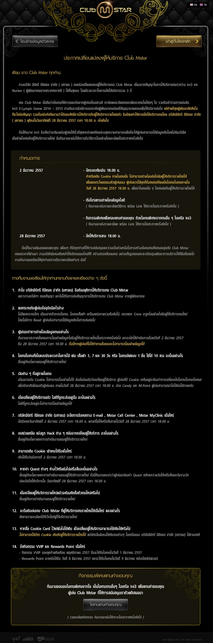 Ini3 แจ้งประกาศเปลี่ยนแปลงผู้ให้บริการเกม Club Mstar