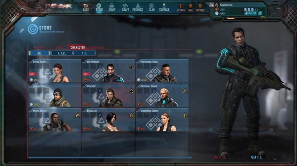 ตัวละครภายในเกมส์นี้แบ่งเป็น 2 ฝ่ายให้เราเลือก ได้แก่ A.T.C หน่วยทหารองค์กรวิจัย Alma และ T.F. หน่วยทหารที่จัดตั้งเพื่อทำลายล้าง Alma ใครอยากอยู่ฝ่ายไหนเลือกซื้อได้เลยครับ ตัวละครแต่ละตัวจะสามารถซื้ออุปกรณ์สวมใส่มาเพิ่มความเท่ห์ เกมส์นี้ก็มีให้เราเลือกกันหลากหลายโดยอุปกรณ์ทุกชิ้นจะดัดแปลงจากอุปกรณที่ทหารใช้กันจริง