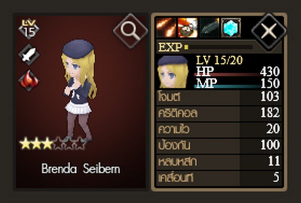 Time Bomb ใช้มานา 50 เป็นสกิลโจมตีหมุ่ ระยะ 3×3 ช่อง เลือกบริเวณโจมตีได้กว้างถึง 6 ช่องรอบ และลดค่าโจมตีของศัตรูลงด้วย (เป็นสกิลที่แจ่มมาก ใช้งานกับศัตรูที่อยู่ไกลได้เป็นกลุ่มๆ เลย)
