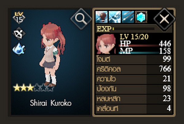 ระยะการเคลื่อนที่ 4 ช่องรอบตัว ระยะโจมตีของสกิลพื้นฐาน 5 ช่องรอบตัว เรียกได้ว่ากว้างมากๆๆๆๆๆ ซึ่งเป็นจุดเด่นของ Shirai Kuroko เลยล่ะ