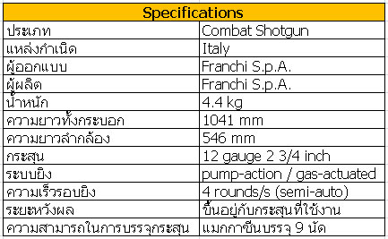 ปืน shot gun คุณภาพสูงจาก โรงงานผลิตชั้นนำ Franchi S.p.A. จากประเทศอิตาลี เป็นชนิด Dual mode ออกแบบมาให้รองรับทั้งระบบ Semi-Automatic และ ระบบยิงแบบ Manual ทีละ 1 นัด