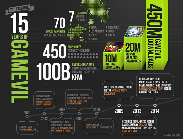 ตั้งแต่ปี 2543 บริษัทของเราเติบโตจนมีพนักงานถึง 450 คน ในพื้นที่ 7 แห่งทั่วโลกที่ทำงานร่วมกับหุ้นส่วนสตูดิโอเกมมือถือกว่า 70 แห่ง และเกมสุดฮิตของเราก็ทำยอดดาวน์โหลดทะลุเป้าไปแล้วหลายเกม ตั้งแต่ Kritika ที่มียอดดาวน์โหลด 10 ล้าน ครั้ง รวมถึงซีรี่ส์ Warlord ที่ทำยอดไปอีก 20 ล้าน ครั้ง รวมแล้วเกมของ GAMEVIL มียอดดาวน์โหลดทั่วโลกไปแล้วทั้งหมด 450 ล้าน ครั้งด้วยกัน และตั้งแต่ไตรมาสที่ 1-3 เราทำรายได้ไปแล้วกว่า 100 พันล้าน วอน