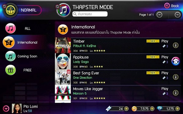 แน่นอนว่า ก่อนหน้านี้จะมีสาวก Thapster บ่นกันหนาหูว่า น่าจะมีเพลงเกาหลีนะ อยากได้เพลงสากลจัง งานนี้ทีมงาน Sinoze ตอบโจทย์ทุกท่านให้แล้ว ด้วยการลงเพลงสากล ทั้งฝรั่ง เกาหลี ที่ติดอันดับชาร์ท มาให้ได้เล่นกันเป็นที่เรียบร้อยแล้ว โดยเพลงสากลนี้ จะเล่นได้เฉพาะ Thapster Mode เท่านั้นนะ