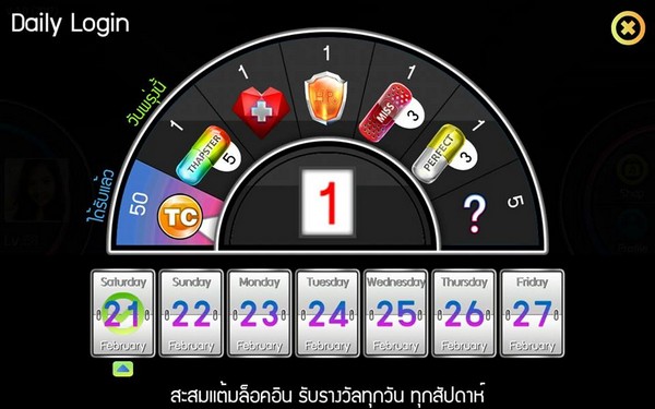 - Daily Login Reward ทุกๆ วันเมื่อเข้าเกม จะได้รับของรางวัล 1 ชิ้นต่อวัน และในแต่ละสัปดาห์ จะมีของรางวัล 7 ชิ้น เรียงตามจำนวนวันที่ Login ภายใน 1 สัปดาห์ หากลืม Login วันใดวันหนึ่ง หรือไม่ได้เข้าเล่นเกม ก็จะได้รับของรางวัลไม่ครบ 7 ชิ้น และของรางวัลจะถูกเปลี่ยนในทุกๆ สัปดาห์