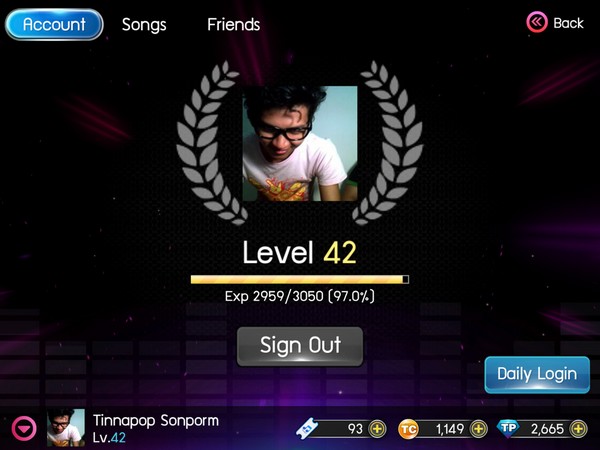 - My Account รายละเอียดข้อมูลพื้นฐานของผู้เล่น (จะต้อง Login ผ่านระบบ Facebook เท่านั้น) ซึ่งในส่วนนี้จะแสดงผล Level / EXP รวมถึงรายชื่อเพื่อนใน Facebook ที่เล่น Thapster อีกทั้งสามารถเข้าไปดูของรางวัล Daily Login ได้