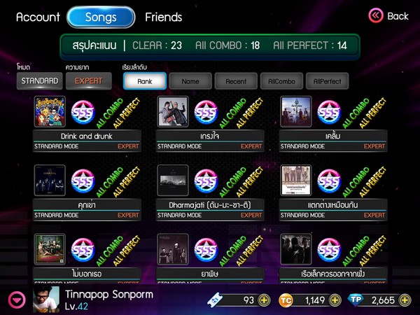 - ตารางสรุปคะแนนเพลง Clear (เล่นจบเพลง), All Combo, All Perfect, All Thapster ทั้งหมด อีกทั้งยังสามารถดูผลการเล่นของเราทุกโหมด ทุกระดับความยาก ซึ่งจะแสดงผล Rank สูงสุดของเพลงนั้นๆ