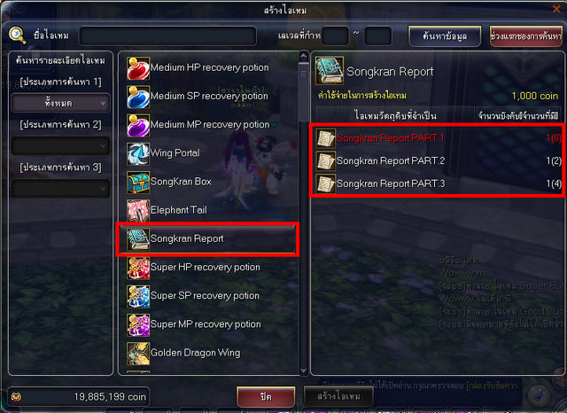 สร้างได้ที่ NPC TauTaw ในพลาซ่า โดยนำส่วนประกอบที่ต้องการคือ Songkran ReportPART 1, 2 และ3 ไปอย่างละ 1 ชิ้น (หาได้จากการกำจัดมอนสเตอร์ในดันเจี๊ยนทั่วไป) แล้วสร้างได้ทันที โดยจะเสียค่าธรรมเนียมในการสร้างจำนวน 1,000 Coin