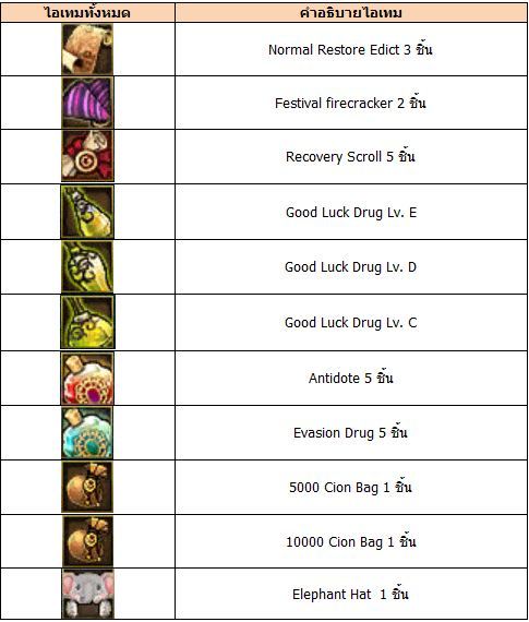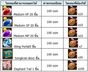 ในภารกิจนี้คุณจะได้รับ SongKran Medal รวบรวมไว้ และสามารถนำไปแลกไอเทมได้ที่ NPC TauTaw ในพลาซ่า โดยเลือกแลกไอเท็มต่างๆ ได้ดังนี้