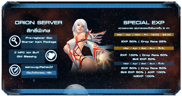 ก่อนจะไปมันส์ในเซิร์ฟเวอร์ ORION นั้นมาดูกันว่ามีการเพิ่มเติมความพิเศษให้กับผู้เล่นในเรื่องของอะไรบ้าง