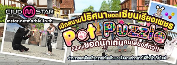 อัพเดทสัตว์เลี้ยงใหม่ให้ทุกท่านได้สะสมกันแล้ว และเพิ่มความสนุกด้วยมินิเกมชิ้นแรก Pet Puzzle สำหรับสัตว์เลี้ยงผู้น่ารักของนักเต้น Mstar ทุกคนเข้าไปฝึกฝนสัตว์เลี้ยงของคุณกันได้เลย สำหรับเกม Mstar กับระบบสัตว์เลี้ยงยังมีมินิเกมให้สนุกกันอีกมากมาย แล้วพบมินิเกมใหม่ได้ในการอัพเดทครั้งต่อๆไป