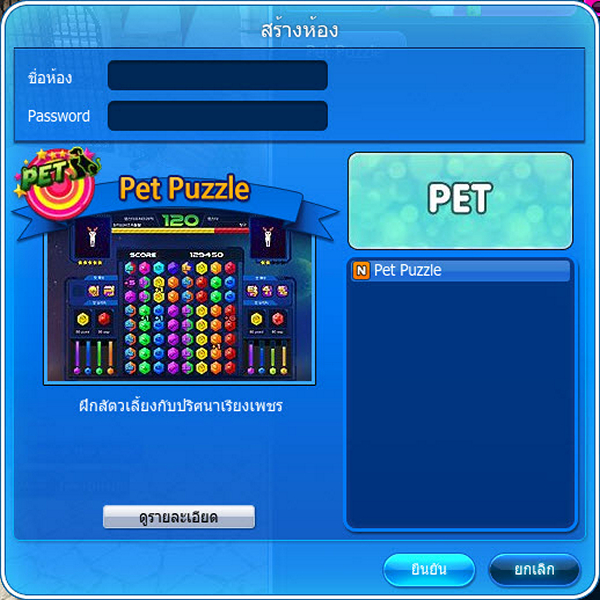 สร้างห้องเริ่มการแข่งขัน Pet Puzzle สำหรับการแข่งขันมินิเกมนี้จะเป็นการแข่งขันแบบ 1 ต่อ 1 กับเพื่อนหากผู้เล่นอยากจะเล่นมินิเกมฝึกสัตว์เลี้ยงคนเดียว ก็สามารถทำได้แต่ต้องใช้ไอเทม Soulful Of Fun จึงจะช่วยให้สามารถเล่นคนเดี๋ยวแล้วได้รับค่าประสบการณ์สัตว์เลี้ยง สำหรับรายละเอียดวิธีการเล่นนั้นสามารถศึกษาอ่านได้ที่ปุ่มรายละเอียด แนะนำว่าอ่านวิธีการเล่นก่อนนะมิเช่นนั้นเล่นแพ้เพื่อนๆ แน่นอน