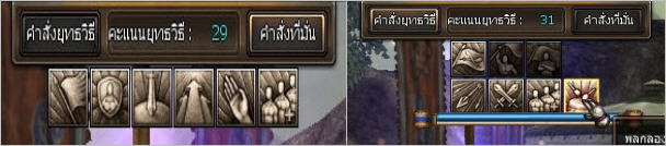 ที่ด้านบนของหน้าจอ นอกจากจะแสดงคำสั่งยุทธวิธี และคะแนนยุทธวิธีแล้ว จะมีปุ่มคำสั่งที่มั่นให้ใช้งาน โดยเราสามารถใช้งานคำสั่งนี้ที่ไหนก็ได้ เพื่อทำให้ฐานของเรามีประสิทธิภาพ ในการบุกยึดเมืองมากขึ้น