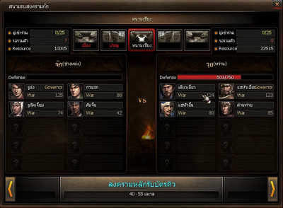 หน้าต่างแสดงข้อมูลของสงครามระหว่างก๊ก ที่หน้าต่างจะแสดงถึงรายละเอียดโดยทั่วไปเกี่ยวกับสงครามระหว่างก๊ก อาทิเช่นสงครามที่เกิดขึ้นอยู่ในเมืองในปัจจุบัน, เขต, จำนวนคนที่เข้าร่วม, ผู้บัญชาการ, การป้องกัน ฯลฯ คลิกที่เครื่องหมายลูกศรด้านซ้ายล่าง และขวาของหน้าจอก็ได้ แล้วเลือกสนามรบที่จะเข้าไปร่วมรบ จะเข้าสู่ช่วงขั้นตอนการรอเข้าสู่สนามรบหากขณะนั้นผู้เล่นในสนามรบเต็ม หากผู้เล่นในสนามรบยังไม่ถึงกำหนดหรือยังไม่เต็ม ก็จะสามารถเข้าสู่สนามรบได้ทันที