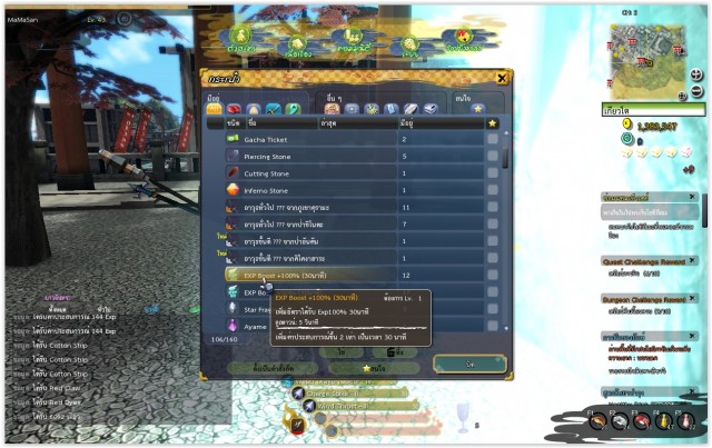 ไอเทม Exp Boost ต่างๆจะมีได้จากภารกิจ ทั้งหลายแหล่ ไม่ว่าทั้งภารกิจหลักภารกิจย่อย ดังนั้นใช้ตอนที่ลงดันเจี้ยนแบบต่อเนื่องกัน จะคุ้มค่าที่สุด ที่สำคัญอย่าลืมปาร์ตี้!
