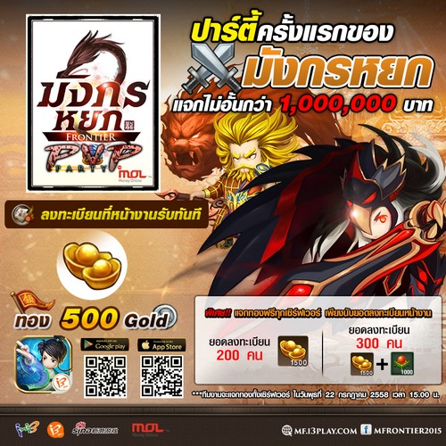 ขอส่งเทียบเชิญชุมนุมจอมยุทธ์ผู้กล้าครั้งยิ่งใหญ่ทั่วทั้งยุทธภพสู่งาน “มังกรหยก Frontier PVP Party by MOL” เพื่อฉลองความสำเร็จเกมมังกรหยก Frontier สู่ล้านไอดี ในวันเสาร์ที่ 18 กรกฎาคม 2558 ณ ร้าน Hard Rock Cafe Bangkok สยามสแควร์ซอย 11 ให้ทุกท่านได้ตะลุยกิจกรรมสุดมันส์สไตล์จอมยุทธ์ พูดคุยแลกเปลี่ยนขอคำชี้แนะวิทยายุทธ์ ใครที่มาร่วมงานรับรองว่าต้องได้ของรางวัลติดไม้ติดมือกลับบ้านอย่างแน่นอน