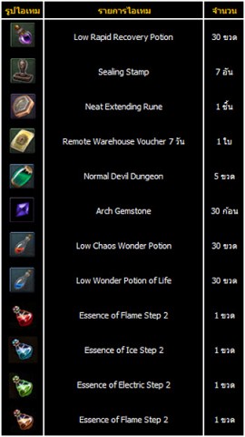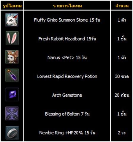 - ไอเทมทั้งหมดจะถูกส่งผ่านทางจดหมายในเกม