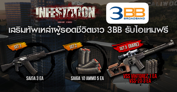 เสริมความมันส์ให้เหล่าผู้รอดชีวิต 3BB กันอีกครั้งในเดือนกันยายน กับชุดไอเทมเสริมทัพ Zombie Survival MMO สุดมันส์ Infestation พร้อมให้ได้ลุ้นรับปืนสไนเปอร์ไรเฟิล VSS Vintorez พร้อมกระสุนให้ใช้เลยทันที เริ่มรับได้เลยตั้งแต่ วันนี้ – 30 กันยายน ศกนี้ เน็ตแรงเล่นเกมมันส์รับไอเทมฟรีต้อง 3BB เท่านั้น ด่วน! ไอเทมมีจำนวนจำกัด มาก่อนรับไปใช้ได้ก่อน