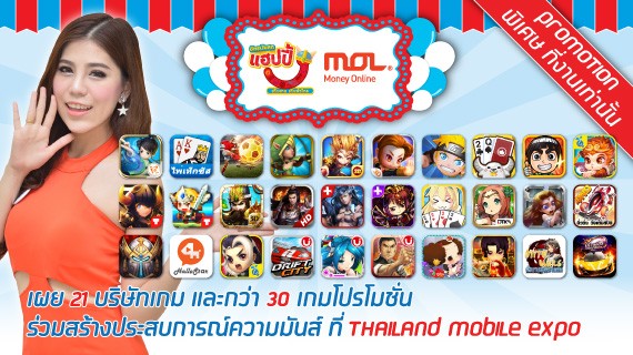 มาปลุกความมันส์ในตัวคุณ ในงาน Thailand Mobile Expo 2015 ที่บูทของ MOL ร่วมกับบัตรเงินสดแฮปปี้ เตรียมกิจกรรมดีๆ โปรโมชั่นโดนๆ จากค่ายเกมชั้นนำทั้งในไทยและต่างประเทศ วันที่ 1 – 4 ตุลาคม 2558 ณ ศูนย์ประชุมแห่งชาติสิริกิติ์ ทั้งหมด 21 ค่ายเกมที่เอาเกมมือถือมาสร้างความประทับใจให้ผู้เข้างานได้รับชมกัน จะมีค่ายไหน เกมอะไรบ้าง เรามีตัวอย่างคร่าวๆ มาบอกต่อกัน