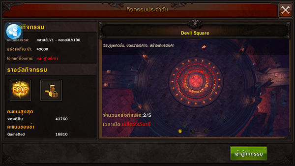อีกหนึ่งกิจกรรมสุดคลาสสิคที่เหล่าสาวก MU Online ยังจำกันได้ดีคงหนีไม่พ้น Devil Square สนามรบที่เหล่าผู้กล้าจะต้องช่วยกันกำจัดปีศาจร้ายในห้วงต่างมิติให้สิ้น นอกจาก EXP จำนวนมาก ยังมีไอเทมยอดเยี่ยมรอคอยผู้กล้าที่แข็งแกร่งที่สุดอยู่ในสนามรบแห่งนี้อีกด้วย การเข้าสู่ Devil Square นั้นผู้เล่นจะต้องมี หลักฐานปีศาจร้าย เป็นใบเบิกทาง ซึ่งสามารถสังเคราะห์ได้จากการประสาน คริสตัลมายัน, กุญแจลับปีศาจ, ดวงตาปีศาจ และ Gold ผูกมัดนิดหน่อย โดย Devil Square นี้จะเปิดให้ผู้เล่นได้เข้าทดสอบความแข็งแกร่งของคุณและเพื่อนร่วมทีม ทุกๆ 30 นาที เตรียมความแข็งแกร่งของคุณไว้ให้พร้อมเพื่อเข้าท้าทายปีศาจแห่ง Devil Square และรับรางวัลสุดคุ้ม