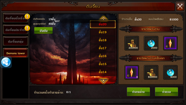 Demon Tower หอคอยปีศาจร้ายอีกหนึ่งดันเจี้ยนที่แสนจะอันตราย แต่ยิ่งอันตรายผลตอบแทนยิ่งคุ้มค่าตามไปด้วยเช่นกัน นอกจาก EXP ที่จะได้รับอย่างมากมายแล้ว Demon Tower แห่งนี้ยังดรอปไอเทมที่สำคัญอย่าง ขนนก, เชื้อเพลิงอินทรีเทพ, คริสตัลชีวิต และไอเทมขั้นสูงอื่นๆ อีกมาก ยิ่งคุณไต่หอคอยปีศาจได้สูงเท่าใดของรางวัลก็ยิ่งมีค่ามากขึ้นเท่านั้น