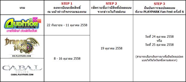 3. เดินทางร่วมงาน PLAYPARK Fan Fest ครั้งที่ 6 เพื่อยืนยันการขอปลดแบน สามารถเลือกไปวันที่ 24 ตุลาคม หรือวันที่ 25 ตุลาคม 2558 ก็ได้ ณ MCC Hall เดอะมอลล์ บางกะปิ ที่บูธปลดแบน โดยนำหลักฐานมายื่นแก่เจ้าหน้าที่ดังนี้