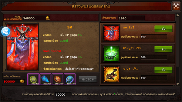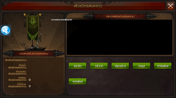 หากพูดถึงเกมส์แนว MMORPG อีกระบบที่ผู้เล่นคุ้นเคยกันดีนั่นคือระบบกิลด์ แน่นอนว่าใน MU Origin-TH ของเราเองก็มีเช่นกัน ซึ่งเราเรียกมันว่า ระบบพันธมิตรสงคราม นอกจากเหล่าพันธมิตรจะร่วมพูดคุยแลกเปลี่ยนข่าวสารกันได้แล้ว การเข้าร่วมใน พันธมิตรสงครามยังเพิ่มความสามารถให้เราได้จาก Buff จำนวนมาก จะรอช้าอยู่ทำไมรีบมาเข้าร่วมพันธมิตรสงครามกับเพื่อนๆ ของคุณกันเถอะ