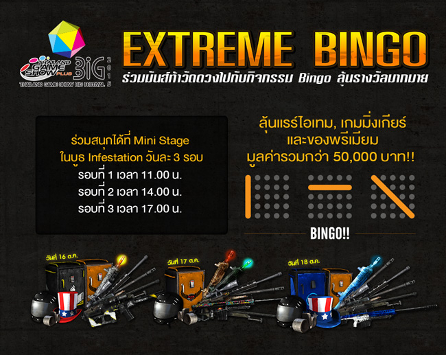 ร่วมมามันส์ท้าดวงของคุณไปกับกิจกรรม Bingo รับกระดาษ ปากกา และนั่งลุ้นไปพร้อมกัน วันละ 3 รอบ ร่วมสนุกได้ที่โซน Mini Stage (ข้างหน้าบูธ) 11.00 น / 14.00 น. / 17.00 น. ในแต่ละรอบ และแต่ละวันของรางวัลจะไม่ซ้ำกัน! มีแรร์ไอเทมที่น่าสนใจคร่าวๆ ประมาณนี้