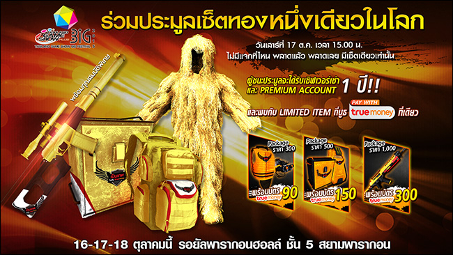 ในส่วนนี้เป็นไฮไลท์ของทางพาร์ทเนอร์ ซึ่งทั้งหมดจะอยู่ในบูธของ True Money (Hall ด้านนอก) เข้าใจตรงกันนะ! โดยแบ่งเป็นโปรโมชั่นจำหน่ายเซ็ตไอเทมทั้งแบบ 300/500 และ 1,000 บาท ซึ่งจะได้รับไอเทมและบัตรเติมเงินดังภาพ โดยไฮไลท์ที่พลาดไม่ได้ที่สุดคือการประมูลไอเทม “เซ็ตทอง 1 เดียวในโลก” ย้ำว่าเซ็ตนี้เป็นไอเทมเซ็ตเดียวที่ทำออกมาให้กับทาง True Money ไม่มีแจกที่ไหน พลาดแล้ว พลาดเลย มีเซ็ตเดียวเท่านั้น! โดยการประมูลจะเริ่มต้นขึ้นใน วันเสาร์ที่ 17 ต.ค. เวลา 15.00 น. ที่บูธ True Money