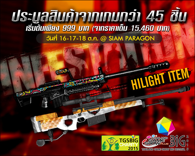 อีกหนึ่งการประมูลเพื่อช่วยเหลือเด็กโรคหัวใจ ในโครงการ TGSBIG Charity 2015 ซึ่งเกม Infestation ก็ได้ส่งไอเทมเข้าร่วมการประมูลทั้งสิ้นกว่า 45 ชิ้น (รวมมูลค่าเซ็ตไอเทมนี้ อยู่ที่ 15,460 บาท) อาทิเช่น AW Magnum TM EDITION, M107 Red Bull และอาวุธปืน ดาบ ตู้เซฟอีกเพียบ เริ่มต้นการประมูลที่ 999 บาท!!