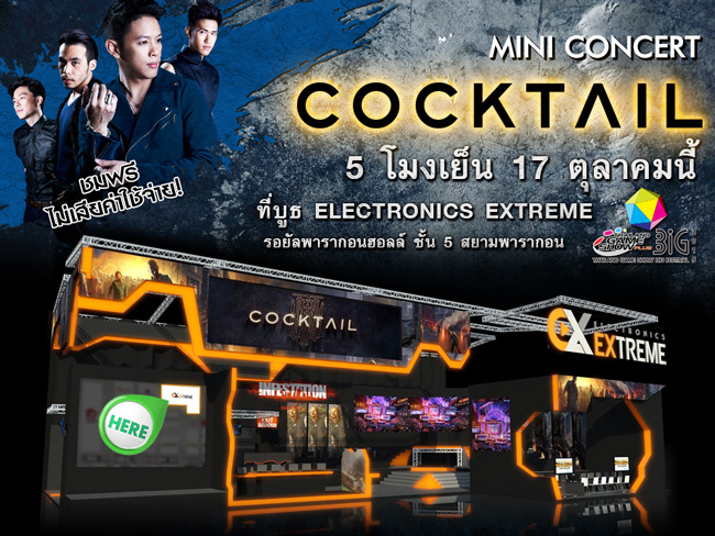 เชียร์แข่งแล้ว เล่นกิจกรรมรับไอเทมฟรีกันแล้ว ก็อย่าพลาดมาชม Mini Concert ด้วย งานนี้บูธ Electronic Extreme ยกวงร็อคกลิ่นอายคลาสสิก เจ้าของผลงานเพลงดัง “คุกเข่า และ เธอ” มาสร้างสีสันให้กับภายในบูธของเรา พบกับ 4 หนุ่มวง “ค็อกเทล”(Cocktail) เหล่านี้ได้ ในวันเสาร์ที่ 17 ต.ค 58 เวลา 17.00 น. (เต็มอิ่ม 1 ชั่วโมงเต็ม)