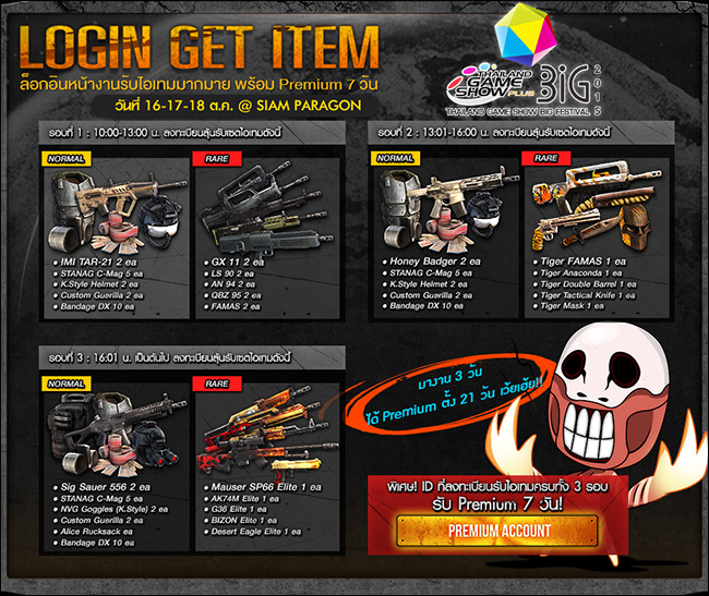 ** TIP : คุ้มที่สุด คือต้องล็อคอินให้ครบ 3 ช่วงเวลาของวัน จะได้รับไอเทมครบทั้ง 3 ชุด (รอบที่ 1 : 10.00 – 13.00 น. / รอบที่ 2 : 13.01 – 16.00 น. / รอบที่ 3 : 16.01 เป็นต้นไป) เซ็ตไอเทมมีทั้งแบบปกติ กับแบบแรร์ แล้วแต่ดวงนะตรงนี้ ล็อคอินเสร็จปุ๊บจะรู้เลยว่าได้เซ็ตไหน