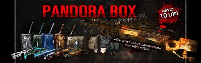 กล่องสุ่มต้องคำสาป ภายในประกอบไปด้วยอาวุธปืนลาย Prize Pool ทั้ง 5 รวมไปถึง Katana, B93R และตู้เซฟลายพิเศษเหล่านั้นด้วย โดยที่แรร์ที่สุดคือ สไนเปอร์ต้องคำสาป “AW Magnum Pandora” หาได้จากที่นี่ที่เดียว! ในงานนี้เท่านั้น ไม่มีเปิดขายออนไลน์ ค่าเปิดครั้งละ 10 บาท!