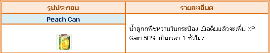 นอกจากสุนุขที่ แสนจะน่ารักขนปุยๆ (อยากเอายางรัดผมมาเปิดตาให้มันจัง) เรายังมีเครื่องดื่มชูกำลัง อย่าง Peach Can หรือน้ำลูกพีช ที่จะเพิ่มพลังให้กับเพื่อนๆที่มีความสามารถในการเก็บเลเวล ข้ามวันข้ามคืนจนเลเวลพุ่งเร็วกว่าเดิม