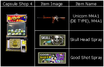 Capsule Shop 4: ปืน Unicorn M4A1 (DE TYPE) ใช้เหรียญชนิด DE ในการลุ้นรับ กำหนดยศที่ จ่าสิบตรี ขั้น 1 เป็นต้นไป