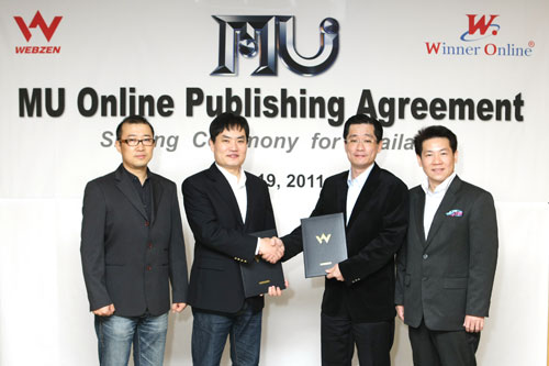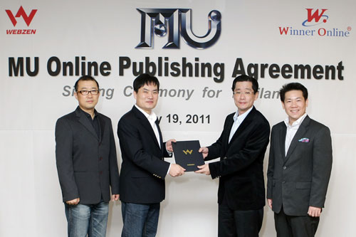 วันที่ 19 พ.ค. 54 เวลาประมาณ 10.30 ของประเทศเกาหลี 2 ผู้บริหารบริษัทวินเนอร์ ออนไลน์ จำกัด คุณมงคล ประภากมล และ คุณสุกิจ พันธ์วิศวาสได้เดินทางเพื่อไปร่วมเซ็นสัญญาอย่างเป็นทางการ กับ Mr.Chang Keun Kim ,CEO ผู้บริหารของบริษัท WEBZEN และ MR.Richard Song, Vice President ของบริษัท WEBZEN ในการนำเกมส์ออนไลน์ MU Online มาเปิดให้บริการในประเทศไทย อย่างเป็นทางการต่อหน้าสื่อของประเทศเกาหลี ที่มารอทำข่าวกันอย่างคับคั่งถึงบริษัท WEBZEN ซึ่งเป็นสถานที่เซ็นสัญญาดังกล่าว